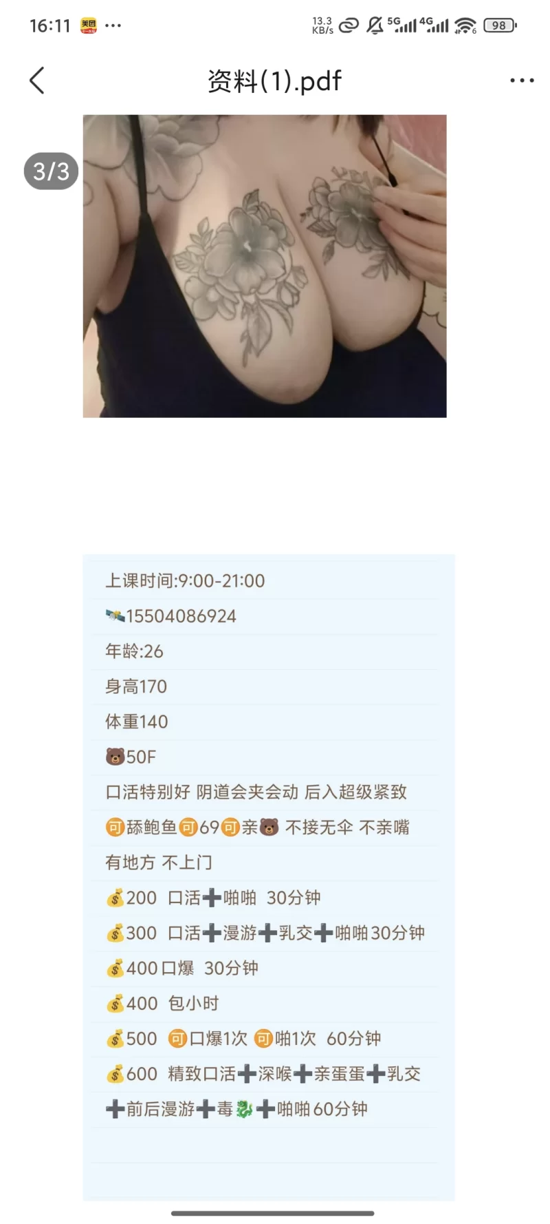 微信附近的人加的好友,聊了一段时间,看朋友圈什么的都正常,周一发朋友圈说没上班好无聊,有没有不上班的出去玩,就微信她了,妹子也没拒绝,告诉了地址就叫我过去找她,到了地方打电话,觉得声音跟朋友圈照片不太匹配,没当回事,然后又说要收拾一下,叫我去帮她买两袋感冒药,走了很远去买的药,回来之后不想玩了,也没什么心思了,打电话,见面,长得还可以,二十岁左右,问了没吃饭,就往旁边一家小牛排店领,菜单一瓶酒一千五,典型的饭托,想要刺激的可以联系一下,自己把握好度,别让骗子骗了。这些人一般都是吉林过来的,到处走,说是做美甲或者美容什么的,大家注意下。